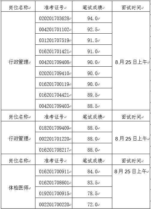 (二)面试时间:2017年8月25日上午。分为上午和下午两场。上午面试8:30正式开始,面试顺序为体检医师岗位、行政管理岗位。