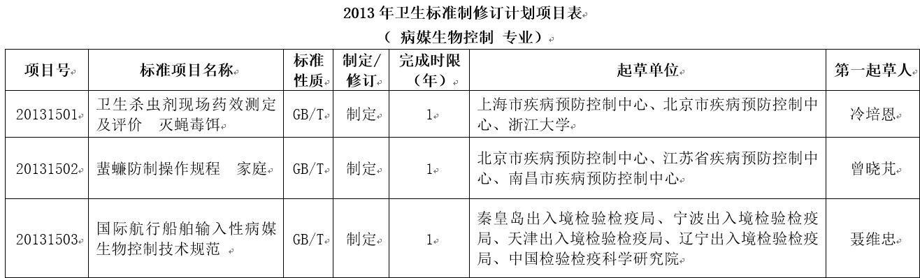 --2013年病媒生物控制标准制修订计划项目
